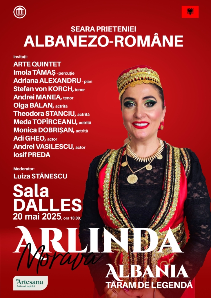 Pe 20 mai, de la ora 18:00, Sala Dalles va găzdui spectacolul extraordinar „Albania – tărâm de legendă”, un veritabil periplu muzical și poetic ce unește armonios tradițiile culturale albaneze și românești. Evenimentul o are în prim-plan pe soprana Arlinda Morava, apreciată atât pentru apariţiile în calitate de solistă, cât şi pentru cele din piese de teatru de suuces. Alături de ea vor evolua pe scenă tenorii Andrei Manea și Ștefan von Korch, acompaniați de ansamblul Arte Quintet, Adriana Alexandru la pian și Imola Tamás la percuție. Programul muzical propune o incursiune rafinată în sonoritățile tradiționale și clasice ale celor două țări, oferind publicului o experiență artistică profundă și emoționantă.