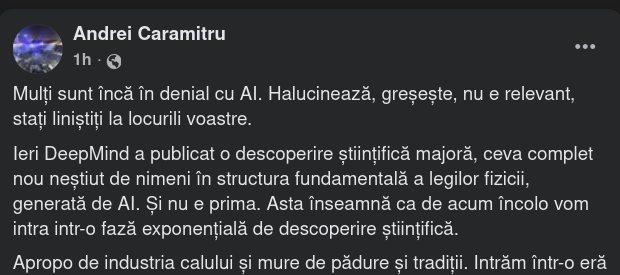 Ce au făcut DeepMind a fost să obțină niște soluții numerice specifice pentru ecuațiile Navier-Stokes și Euler 3D, folosite în mecanica fluidelor, într-adevăr cu un grad de precizie mai înalt decât ce a existat până acum. Au făcut asta cu machine learning, nu cu AI, adică au creat niște instrumente de calcul automat prin care au explorat spațiul infinit al soluțiilor acestor ecuații într-un mod eficient și țintit, până când au dat de niște zone interesante. Iei ecuația, bagi numere în ea, vezi dacă sunt bune sau nu, resetezi, repeți, de miliarde de ori. Ei argumentează că au suficient de multă precizie încât să poată spună că au demonstrat riguros matematic existența acelor zone. Articolul e deocamdată doar pe arXiv, nu a trecut prin niciun filtru de recenzie, deci rămâne de văzut ce spune comunitatea matematicienilor și fizicienilor matematicieni. Mă îndoiesc că Caramitru jr. o să stea să urmărească asta, însă.