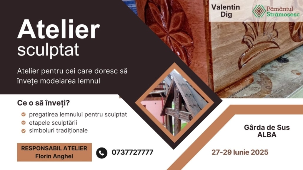 Asociația Pământul Strămoșesc vă invită la Atelierul de sculptură în lemn, cu meșterul Valentin Dig, pe 27-29 iunie 2025
