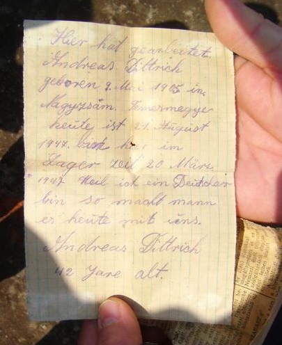 „Mă numesc Andreas Diettrich, născut la 9 mai 1905 în Nagyzsam, lângă Timişoara. Am fost închis aici între 20 martie şi 21 august 1947. Sunt etnic german în vârstă de 42 ani, care am lucrat în acest lagăr”, se menţionează în scrisoare. Scrisoarea a fost conservată și este expusă în Muzeul Orașului Oradea.