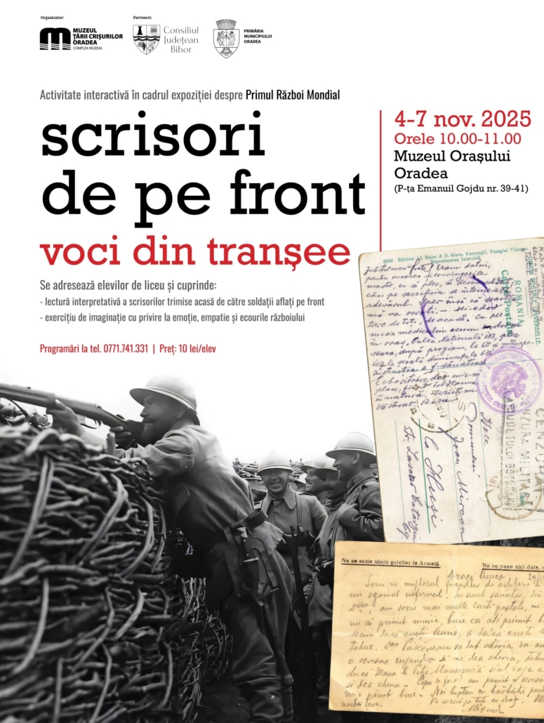 Atelierul de educație muzeală „Scrisori de pe front. Voci din tranșee” este destinat elevilor de liceu și va avea loc în perioada 4-7 noiembrie, ora 10.00, la Muzeul Orașului Oradea, aflat în incinta Cetății Oradea.