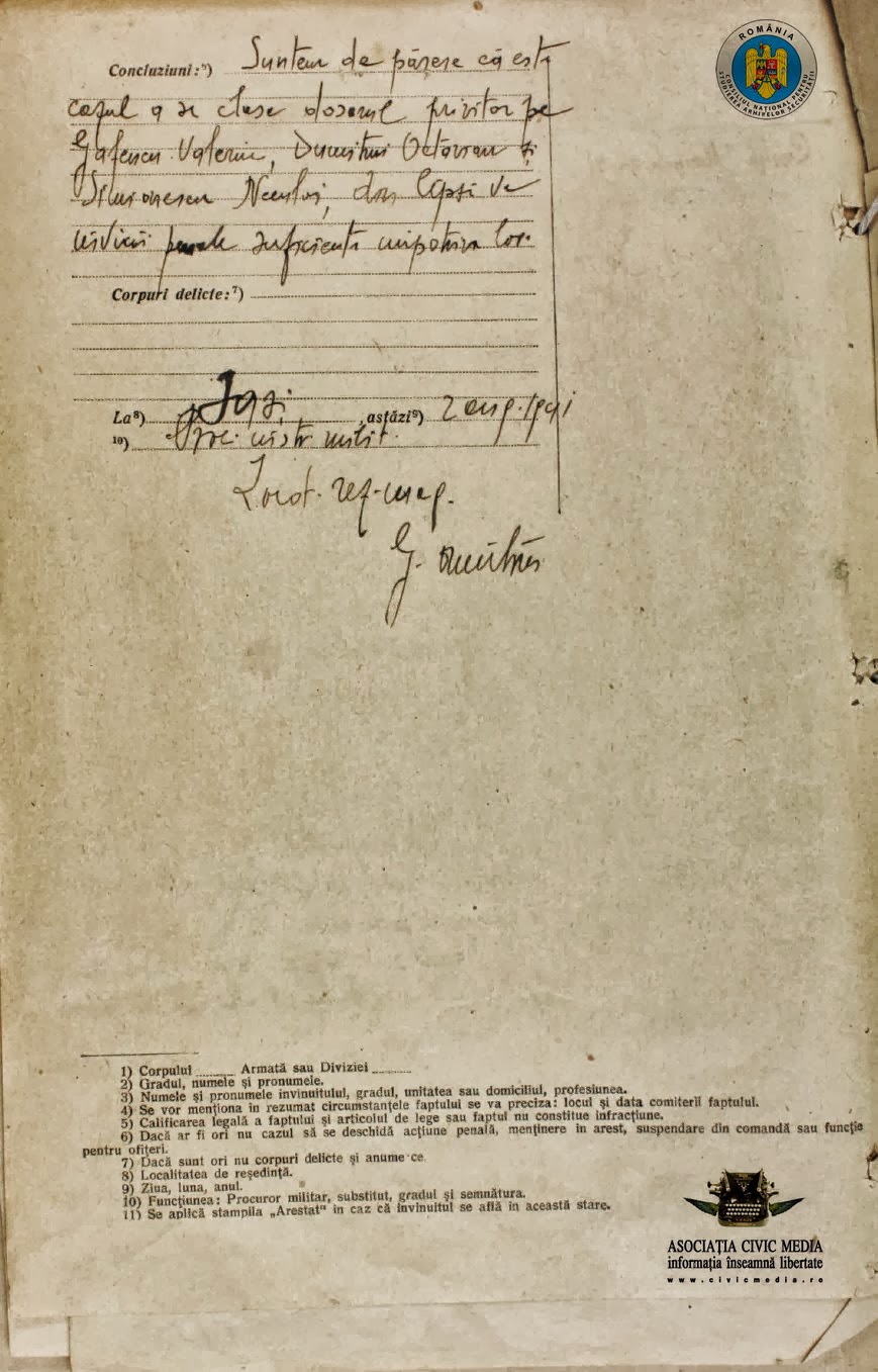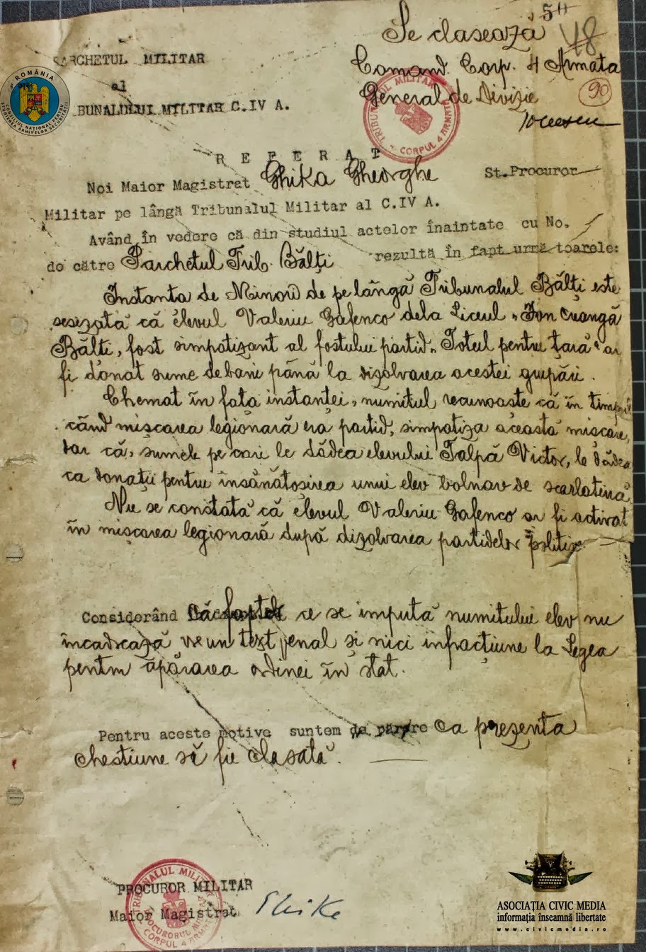 De asemenea, am prezentat un alt document al Parchetului Militar al Tribunalului Militar Corp IV Armată, în care „NU se constată că elevul Valeriu Gafencu ar fi activat în mișcarea legionară după dizolvarea partidelor politice”. „Considerând că faptele ce se impută numitului elev nu încadrează vreun text penal și nici infracțiune la Legea pentru apărarea ordinei în stat. Pentru aceste motive suntem de părere ca prezenta chestiune să fie clasată” – cu rezoluția „se clasează”, semnată de Comandantul Corpului 4 Armată (vezi documentul 2).