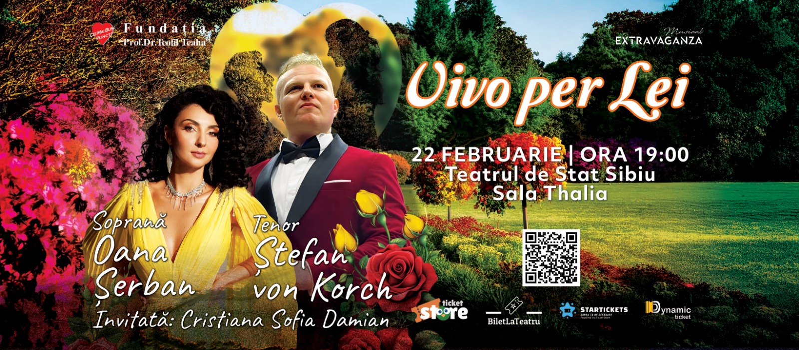 Program artistic îndelung aplaudat la Bucureşti, Piteşti şi în deschiderea Campionatului Mondial Ecvestru de Anduranţă, ajunge în premieră la Sibiu: pe 22 februarie muzica devine limbajul universal al iubirii. Recitalul „Vivo per lei” este o adevărată sărbătoare a vieţii, muzicii şi iubirii, un spectacol cu un repertoriu bogat ce trece de la opera la pop-opera şi poartă publicul printr-o vâltoare de sonorităţi şi sentimente.