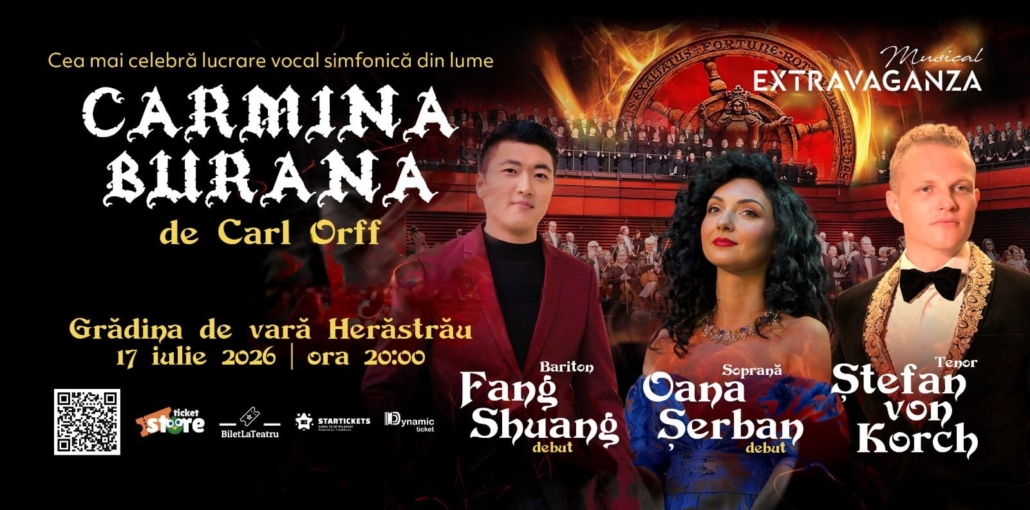 /0 Comments/in Prezentări, Stiri/by Patrick MatisCarmina Burana – cea mai celebră creaţie vocal simfonică scrisă vreodată – cunoscută şi drept lucrarea ce prin tradiţie, închide şi deschide stagiunile filarmonicilor din lumea întreagă, va fi în pusă în scenă în premieră în aer liber în Bucureşti la Grădina de Vară Herăstrău pe 17 iulie 2026. Evenimentul aduce în prim-plan o formulă interpretativă de elită ce îi va include ca solişti pe: tenorul ŞTEFAN VON KORCH, soprana OANA MARIA ŞERBAN şi baritonul FANG SHUANG.
