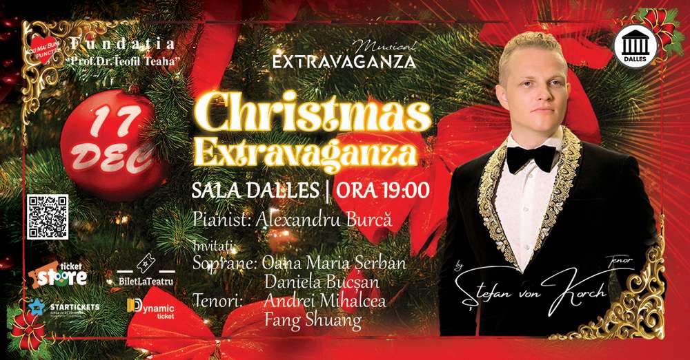 Bucuria Crăciunului, dar ş darul nepreţuit al muzicii vor fi sărbătorite la Sala Dalles pe 17 decembrie în concertul Christmas Extravaganza, alături de tenorul Ştefan von Korch, pianistul Alexandru Burcă şi de solişti apreciaţi ce v-au încântat în decursul acestui an în seria Musical Extravaganza. Cei ce se vor alătura feeriei de sărbători sunt: sopranele Oana Maria Şerban şi Daniela Bucşan, tenorul Andrei Mihalcea şi baritonii Fang Shuang şi Lucian Petrean.