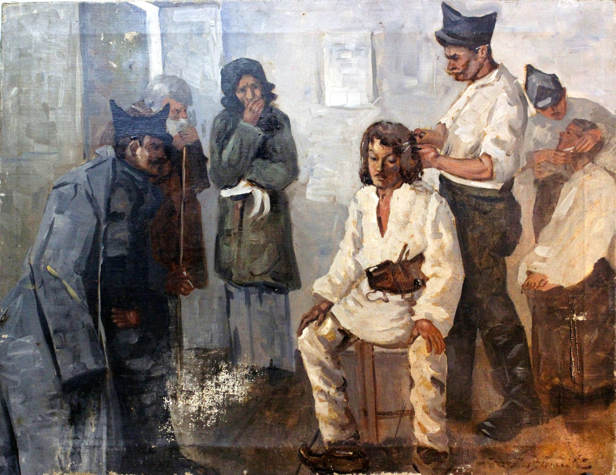 De pildă tabloul intitulat „Recrutul”, semnat de Octav Băncilă, redă, în prim plan, un tânărul țăran-recrut, șezând, care este tuns de către frizerul unității, țăran venit în ziua încorporării îmbrăcat în costum popular obișnuit (cămeșă strânsă la brâu cu chimir, ițari și opinci). În plan secundar, în stânga, sunt redați bătrânii și deznădăjduiții părinți ai celui încorporat, iar în dreapta se observă un alt recrut care este ras de către bărbierul unității, întreaga scenă petrecându-se sub atenta supraveghere a unu gradat. Fidel realismului social care i-a caracterizat întreaga operă, și în această situație pictorul Octav Băncilă ne transmite foarte tranșant, chiar brutal, stările sufletești ale personajelor, respectiv deznădejdea și durerea părinților, resemnarea tânărului recrut în opoziție cu indiferența soldaților, oarecum blazați de rutina militară.