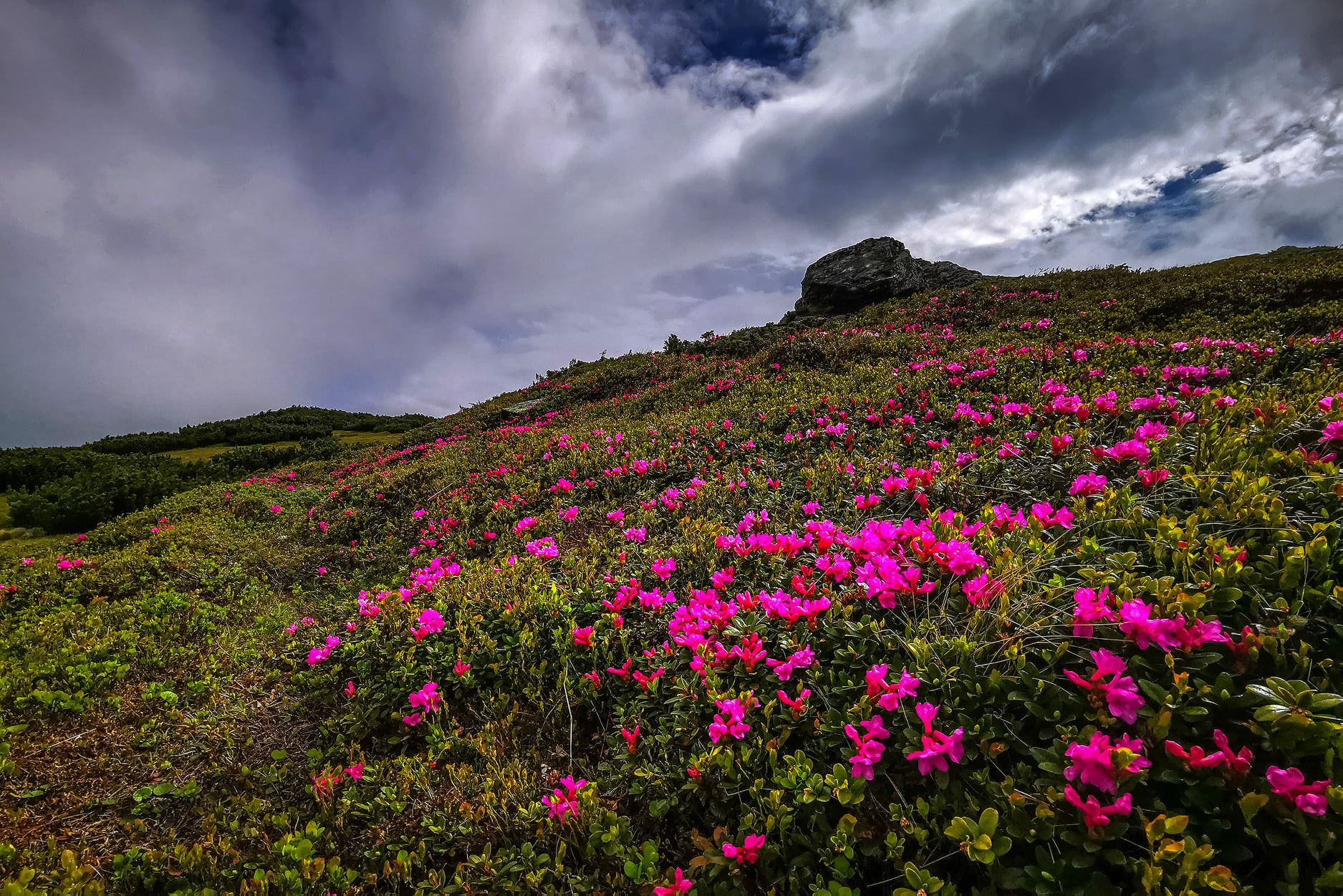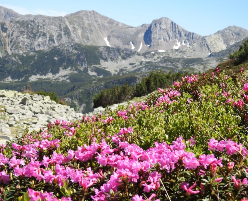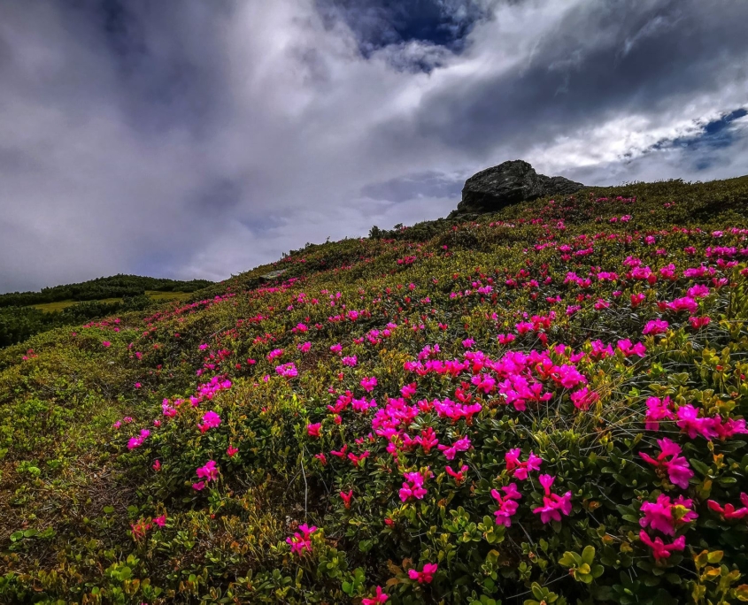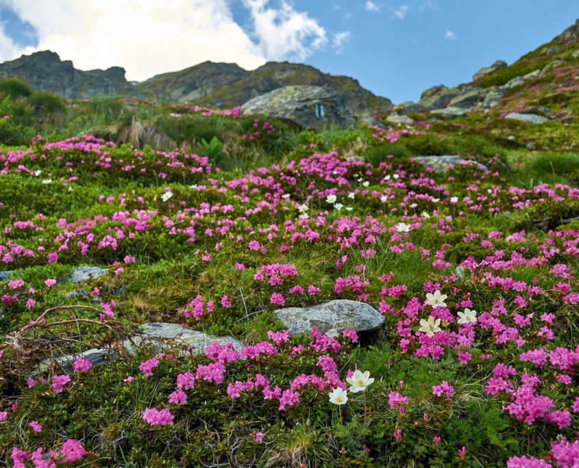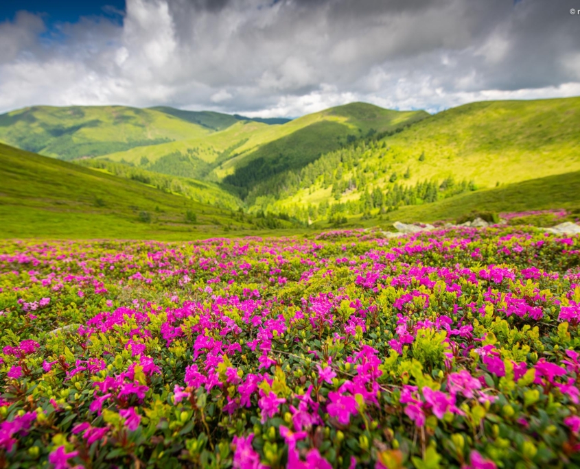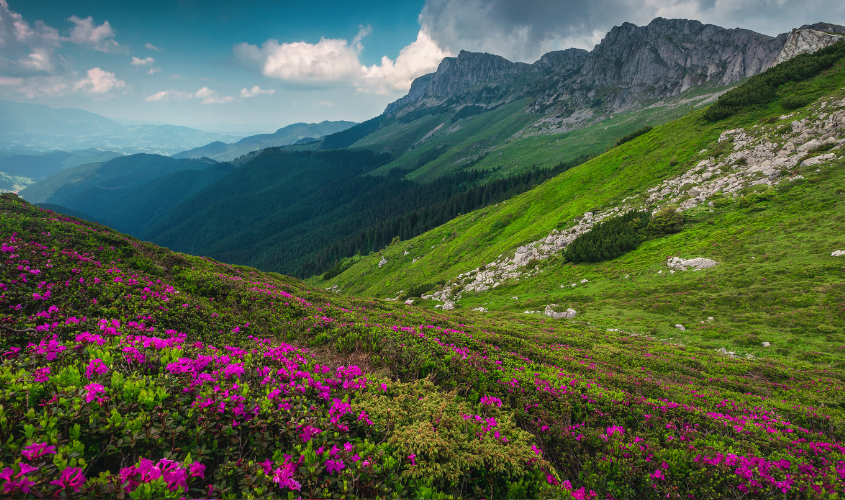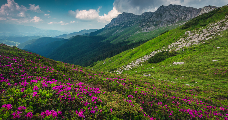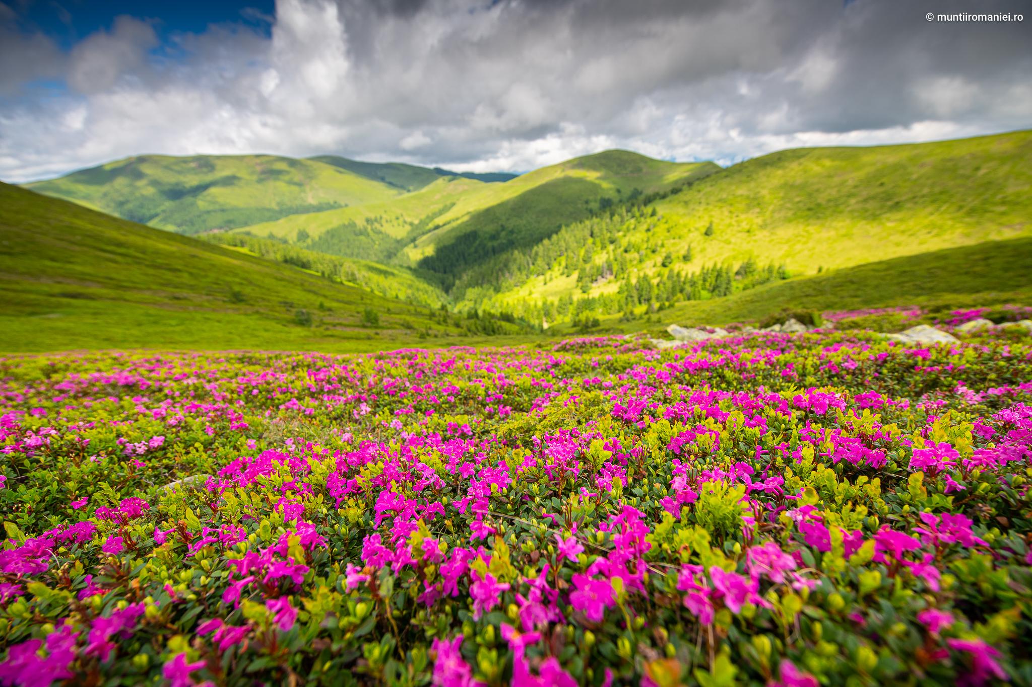 Zone deosebit de pitorești oferă și munții, îndeosebi în luna iunie, când înflorește Rododendronul (bujorul-de-munte – Rhododendron myrtifolium), numit popular Smârdarul. Această specie se poate admira în Munții Rodnei, Munții Bucegi, Munții Făgăraș, Munții Ciucaș (îndeosebi, dând numele Muntelui Roșu), Munții Retezat, Munții Țibleș, Munții Parâng etc.