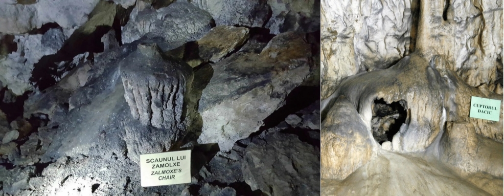 În galeriile peșterii se află un tron de piatră intitulat „Scaunul lui Zamolxe” precum și o formațiune din piatră care sugerează forma rădăcinilor plantei „polovragă”.