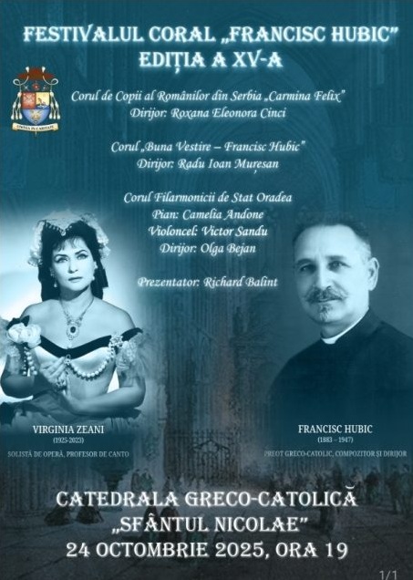 Episcopia Română Unită cu Roma de Oradea vă invită vineri, 24 octombrie 2025, ora 19:00, în Catedrala Greco-Catolică „Sfântul Nicolae”, la cea de-a XV-a ediție a Festivalului Coral „Francisc Hubic”.