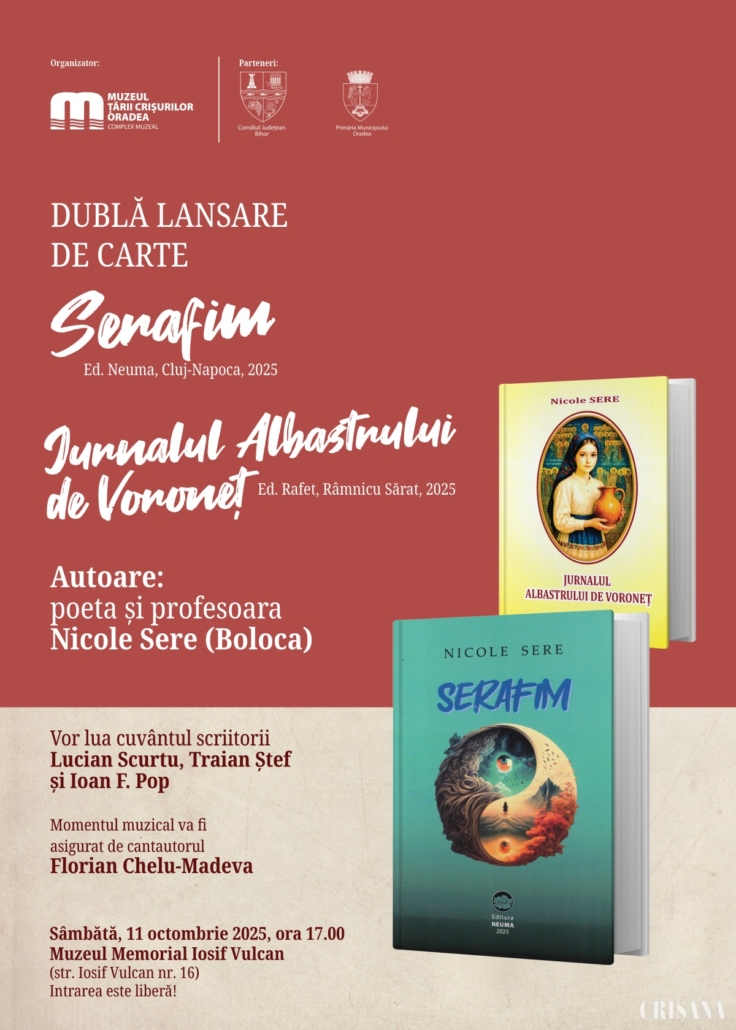 Muzeul Ţării Crişurilor Oradea – Complex Muzeal organizează, în parteneriat cu Consiliul Județean Bihor și Primăria Municipiului Oradea, a organizat lansarea a două cărți aparținând poetei și profesoarei Nicole Sere (Boloca): „Serafim”, Ed. Neuma, Cluj-Napoca, 2025, și „Jurnalul albastrului de Voroneț”, Ed. Rafet, Râmnicu Sărat, 2025. Cărțile vor fi prezentate de scriitorii Lucian Scurtu, Traian Ștef și Ioan F. Pop, iar momentul muzical va fi asigurat de cantautorul Florian Chelu-Madeva.