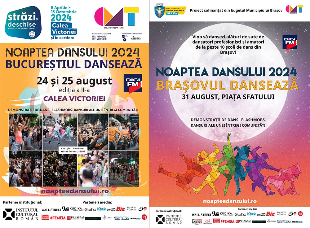 „Noaptea Dansului”, cel mai mare eveniment de dans urban din țară, se reîntoarce în 2024 cu două ediții spectaculoase. „Bucureștiul dansează” pe 24 și 25 august pe Calea Victoriei, iar pe 31 august tot „Brașovul dansează” în Piața Sfatului!