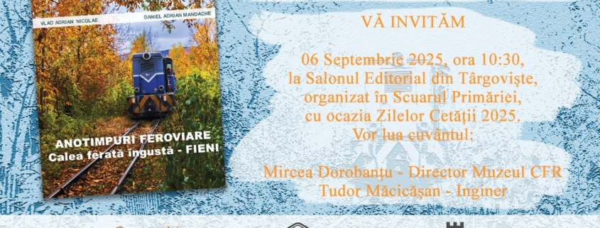 În data de 6 Septembrie 2025, ora 10:30, la Salonul Editorial din Târgoviște organizat în Scuarul Primăriei cu prilejul Zilelor Cetății, va avea loc lansarea cărții „Anotimpuri feroviare – Calea ferată îngustă Fieni”, realizată de Vlad Adrian Nicolae și Daniel Adrian Mandache. Evenimentul este organizat de către Biblioteca Județeană Dâmbovița.