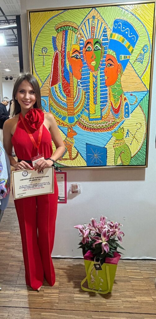 Ea a expus în Galeria Association Cedar Art & Culture tabloul „Misterul Regilor Soarelui”, realizat în acrilic în tehnică mixtă cu reliefuri texturate. Inspirată din mitologia egipteană, reinterpretată într-o cheie contemporană, lucrarea îmbină culori vii, forme simbolice și elemente geometrice.